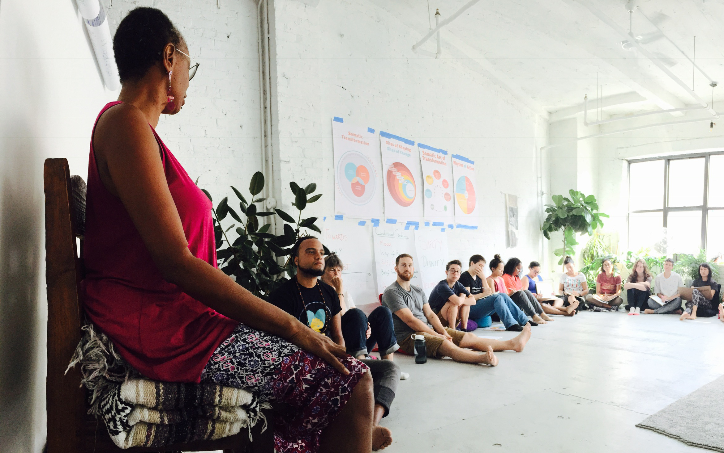 The purpose of healing groups is to offer participants a space to move through the arc of transformation within a group setting. The aim is embodied healing. A group is a very powerful setting in which to heal because it offers both social and relational reflection, and the possibility to regenerate safety, connection and belonging. For politicized healers to run groups, they need to have training in:
